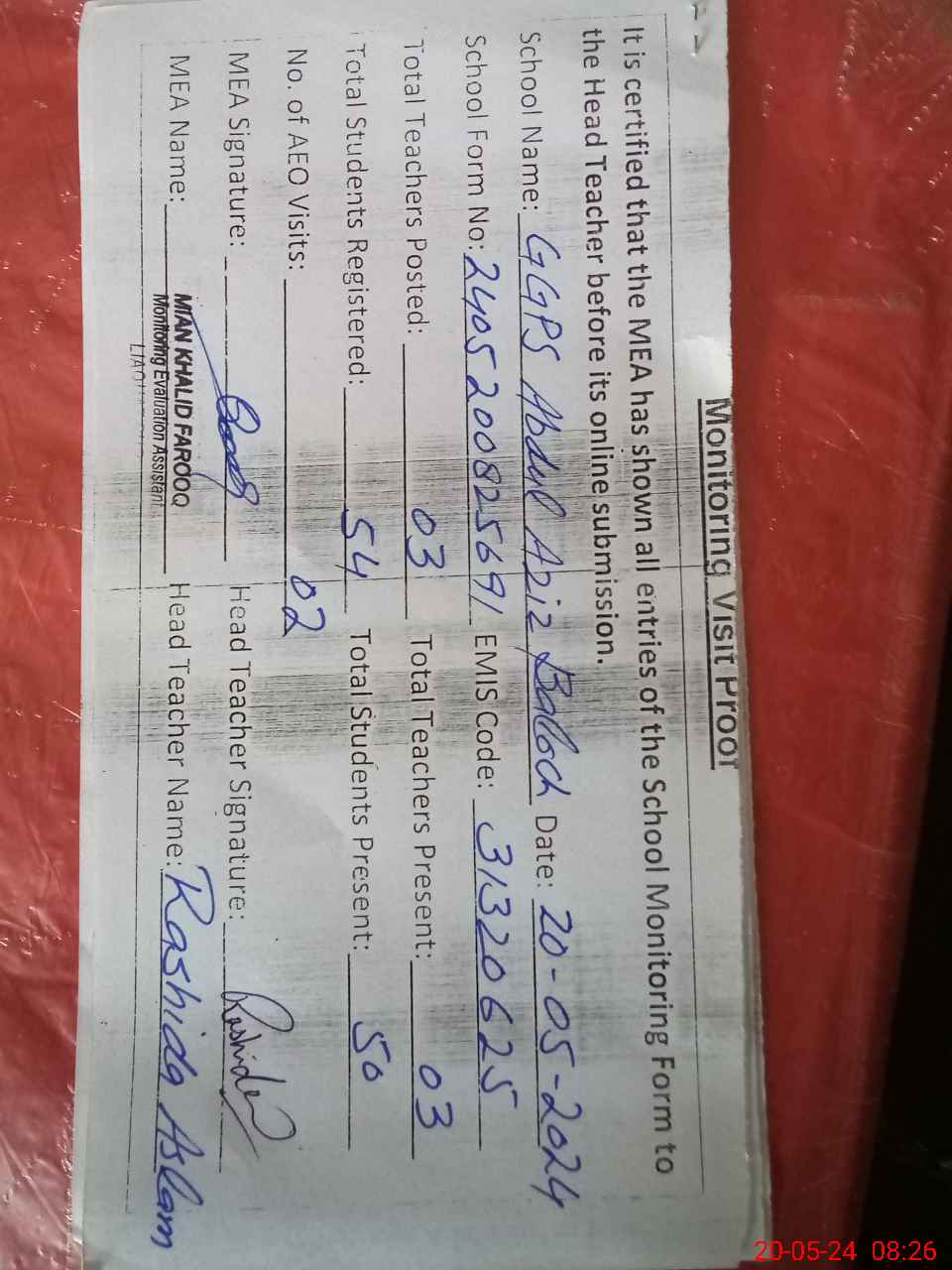 | EMIS Code: 31320625 | Name of School: GGPS ABDUL AZIZ BALOCH | |||