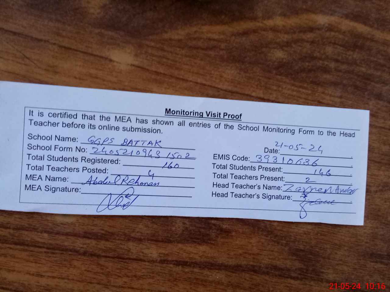| Attendance Register | Head Teacher | MEA with School | Visit Proof |