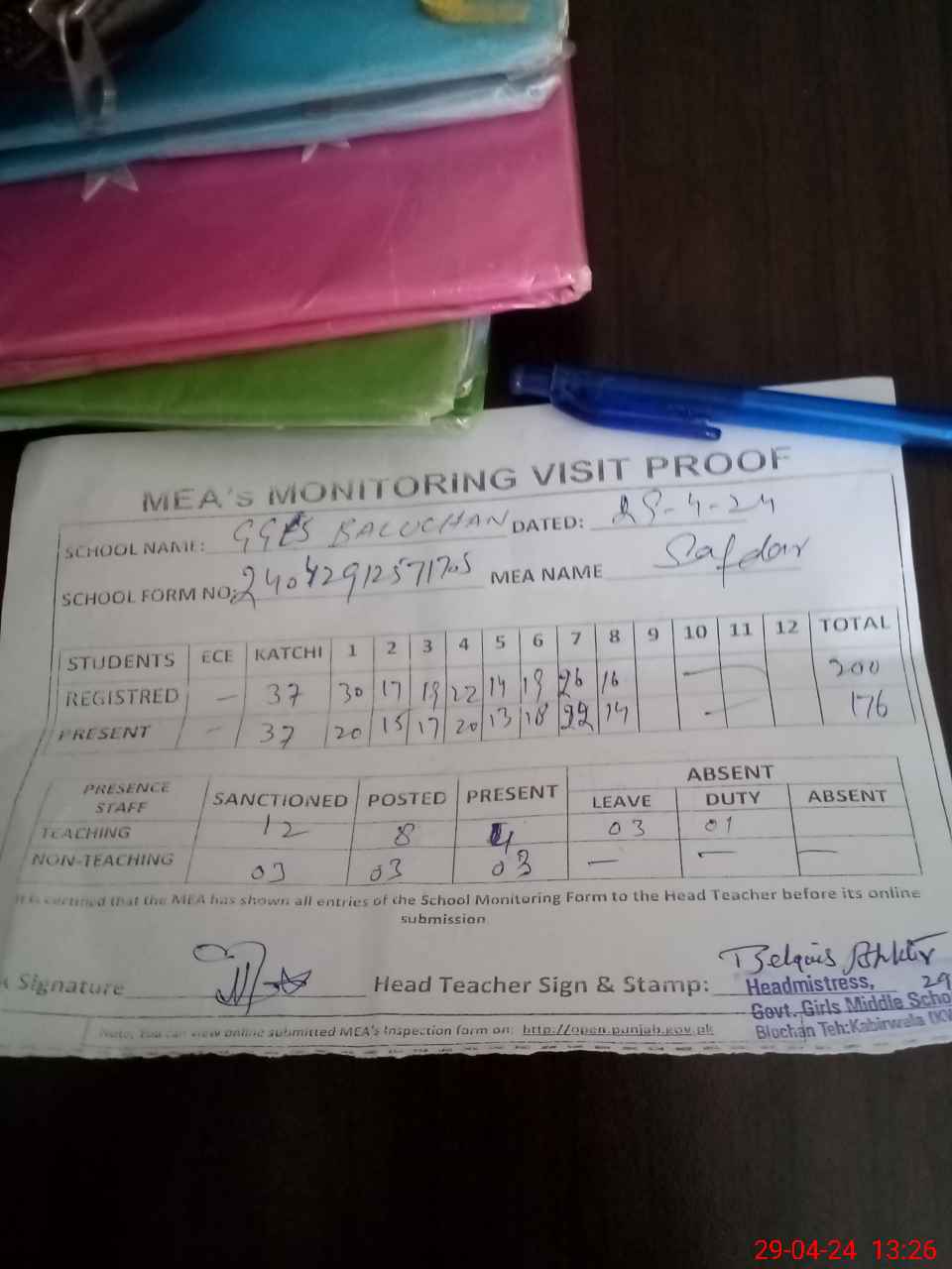 | Attendance Register | Head Teacher | MEA with School | Visit Proof |