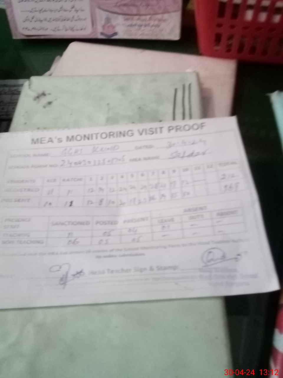 | Attendance Register | Head Teacher | MEA with School | Visit Proof |