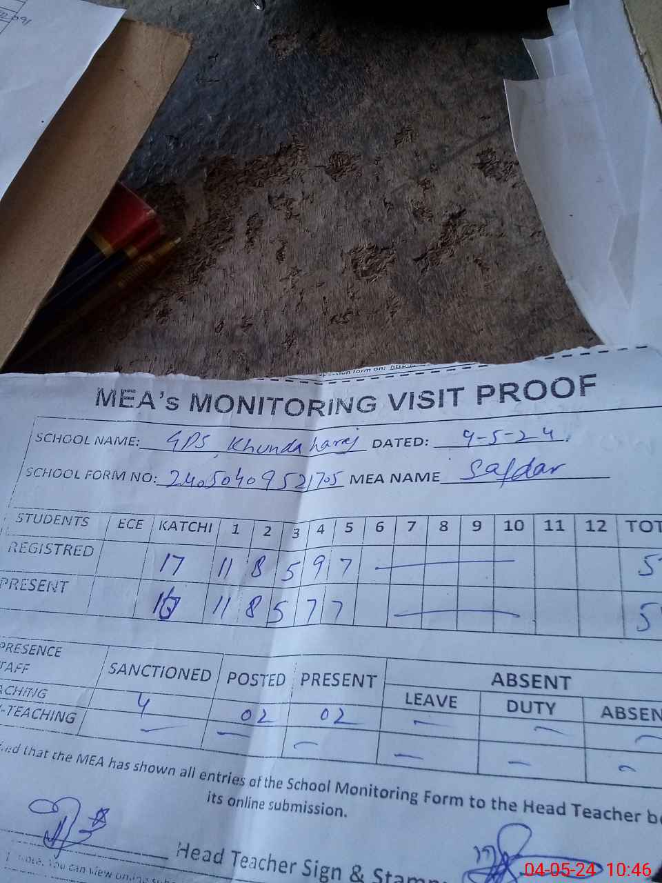 | Attendance Register | Head Teacher | MEA with School | Visit Proof |