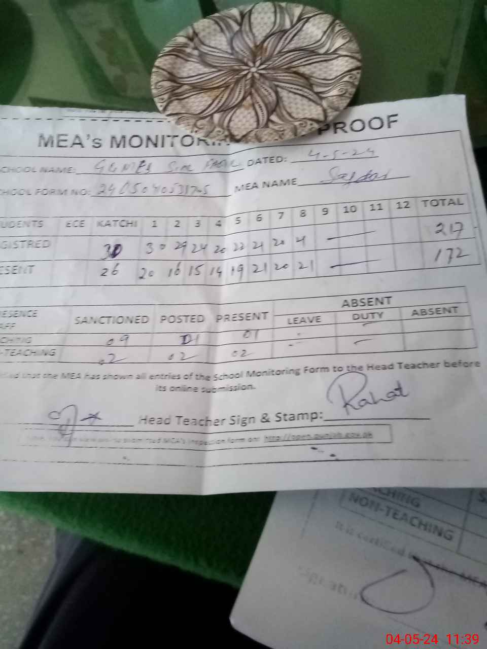 | Attendance Register | Head Teacher | MEA with School | Visit Proof |