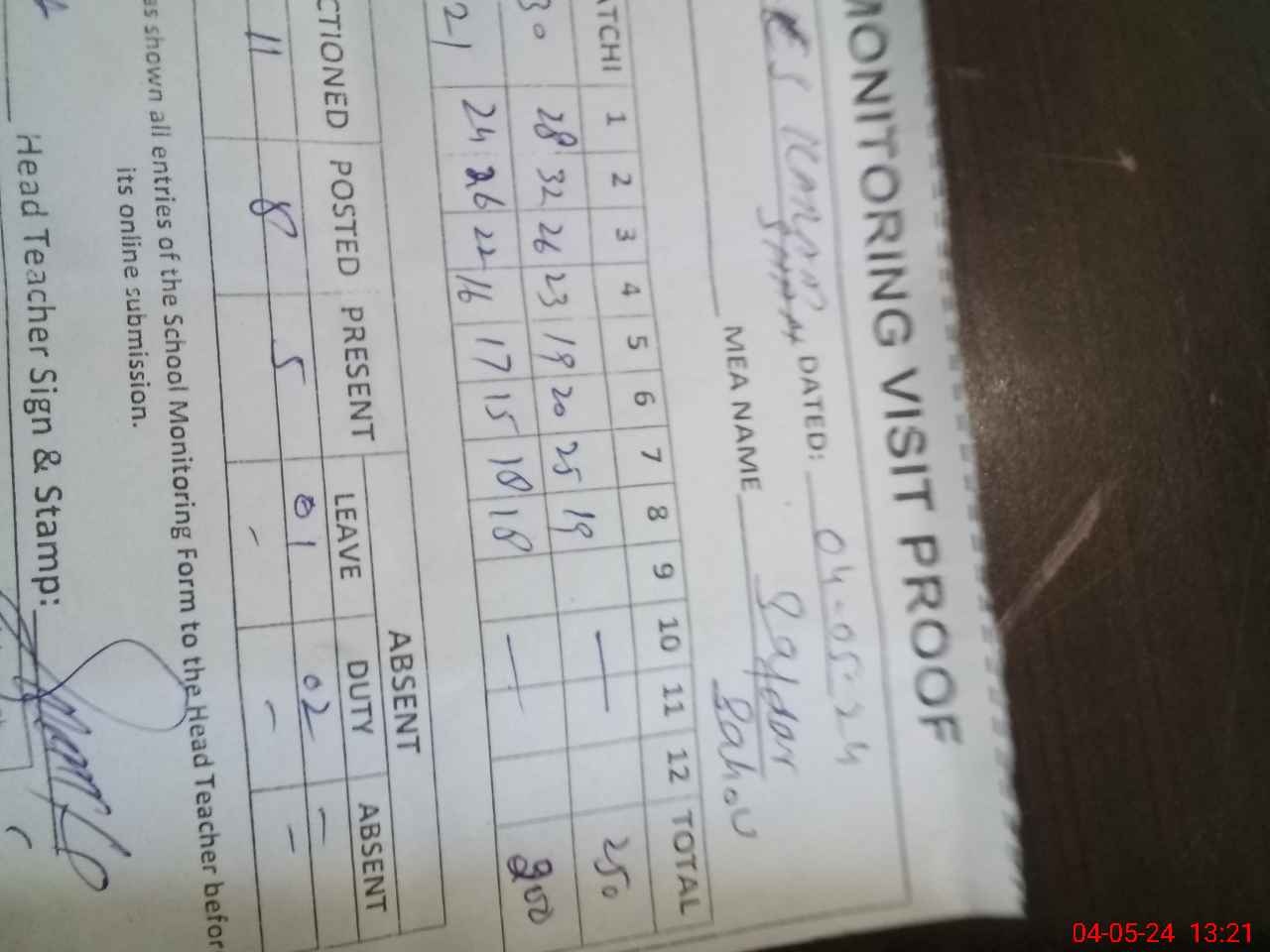 | Attendance Register | Head Teacher | MEA with School | Visit Proof |