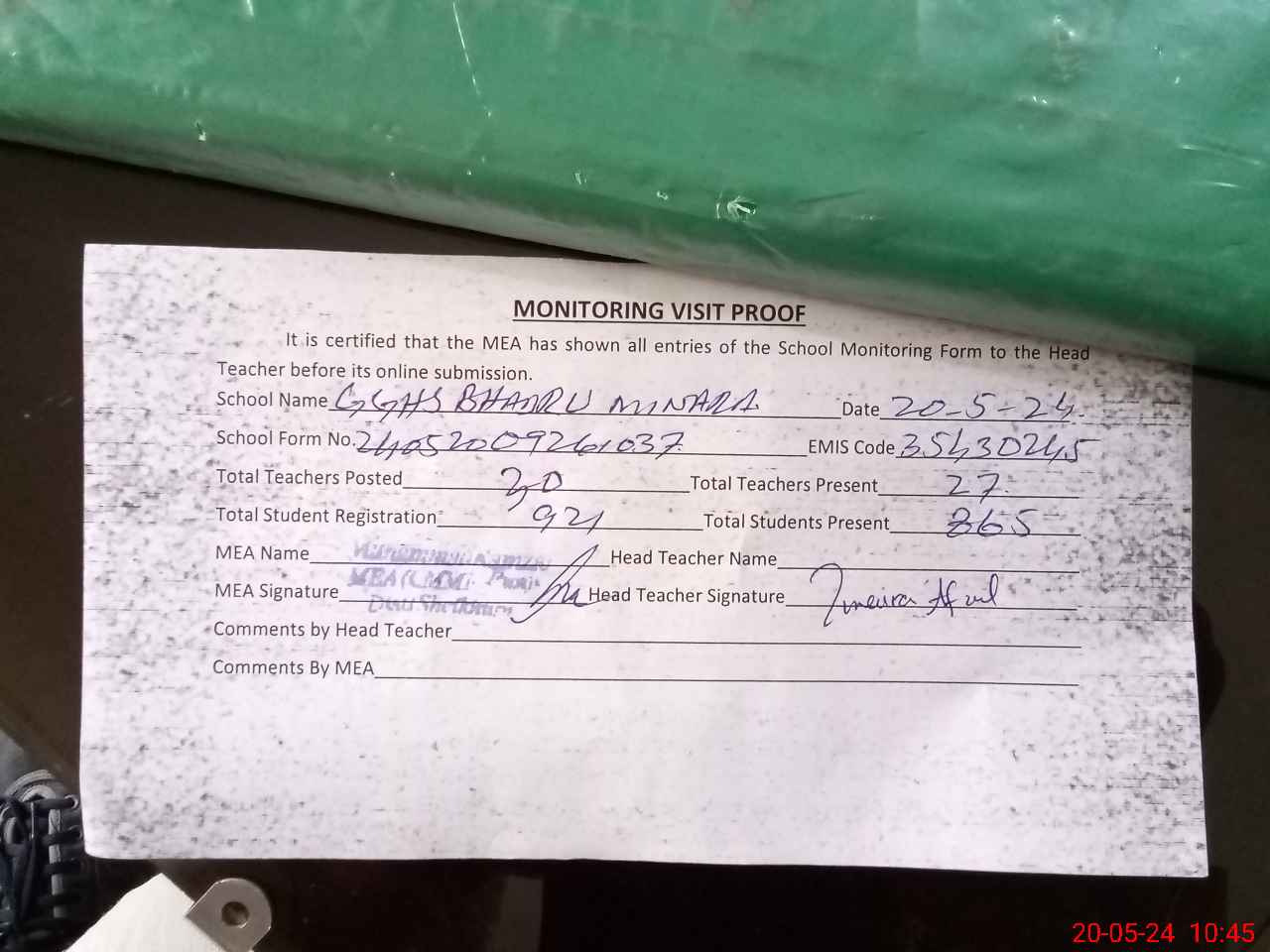 | Attendance Register | Head Teacher | MEA with School | Visit Proof |