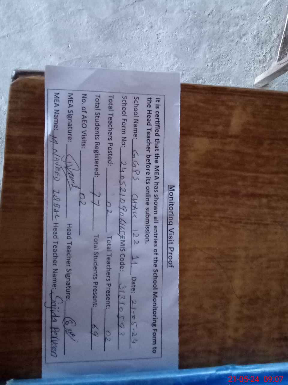 | Attendance Register | Head Teacher | MEA with School | Visit Proof |