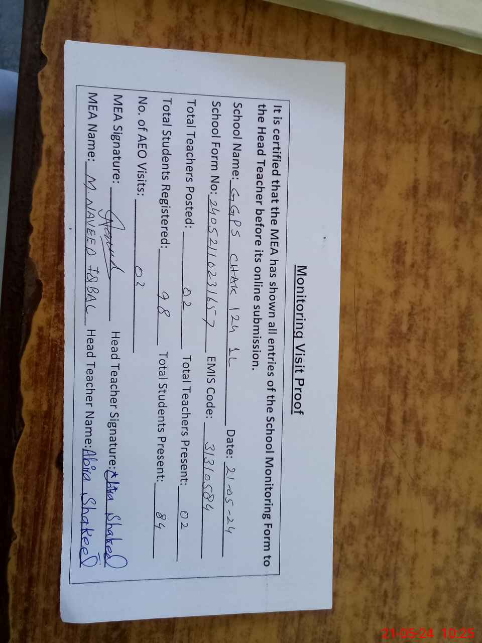 | Attendance Register | Head Teacher | MEA with School | Visit Proof |