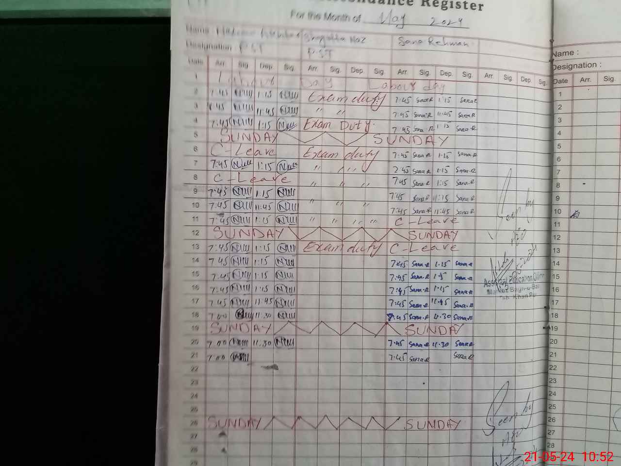 | 31**** | Sh**** Na**** | 1 | 1 | 0 | 0 | 0 | 0 | 0 | 0 | 0 | 0 | 0 | Exam Duty |
