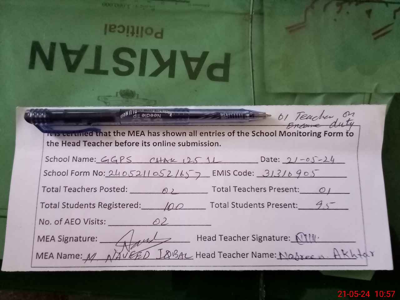 | Attendance Register | Head Teacher | MEA with School | Visit Proof |