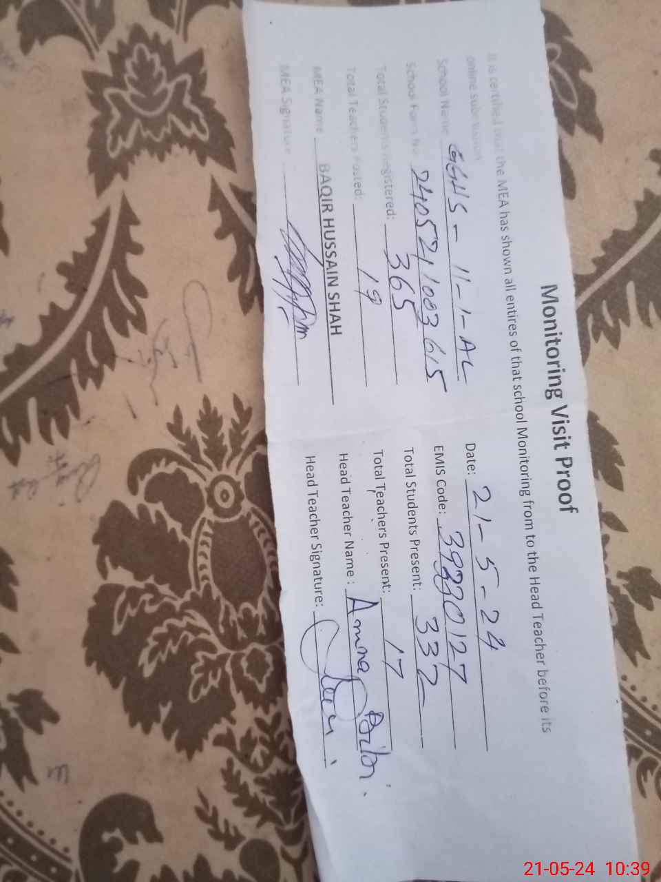 | Certified that this School was Inspected by the Undersigned MEA/DMO Today and the Information Stated Above is as Per Record. | |||||