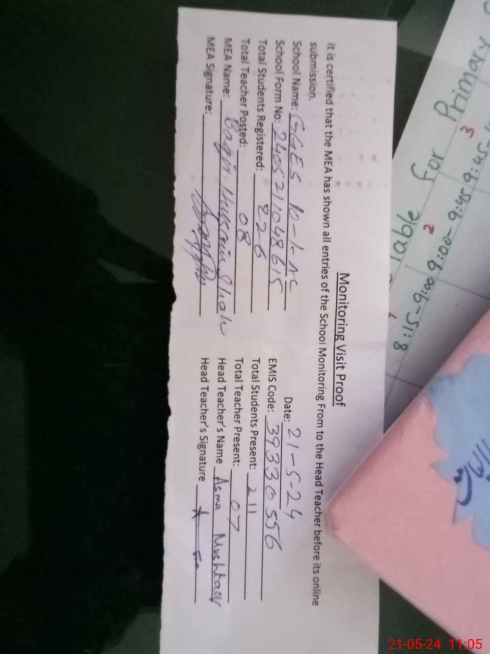 | Attendance Register | Head Teacher | MEA with School | Visit Proof |