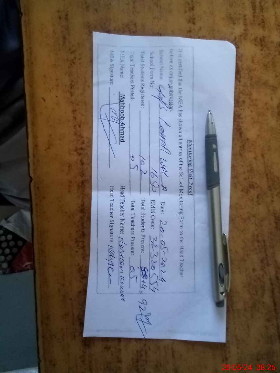 | Attendance Register | Head Teacher | MEA with School | Visit Proof |