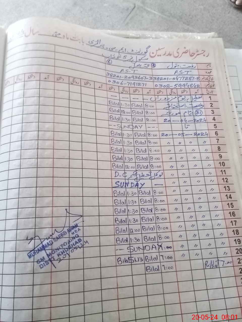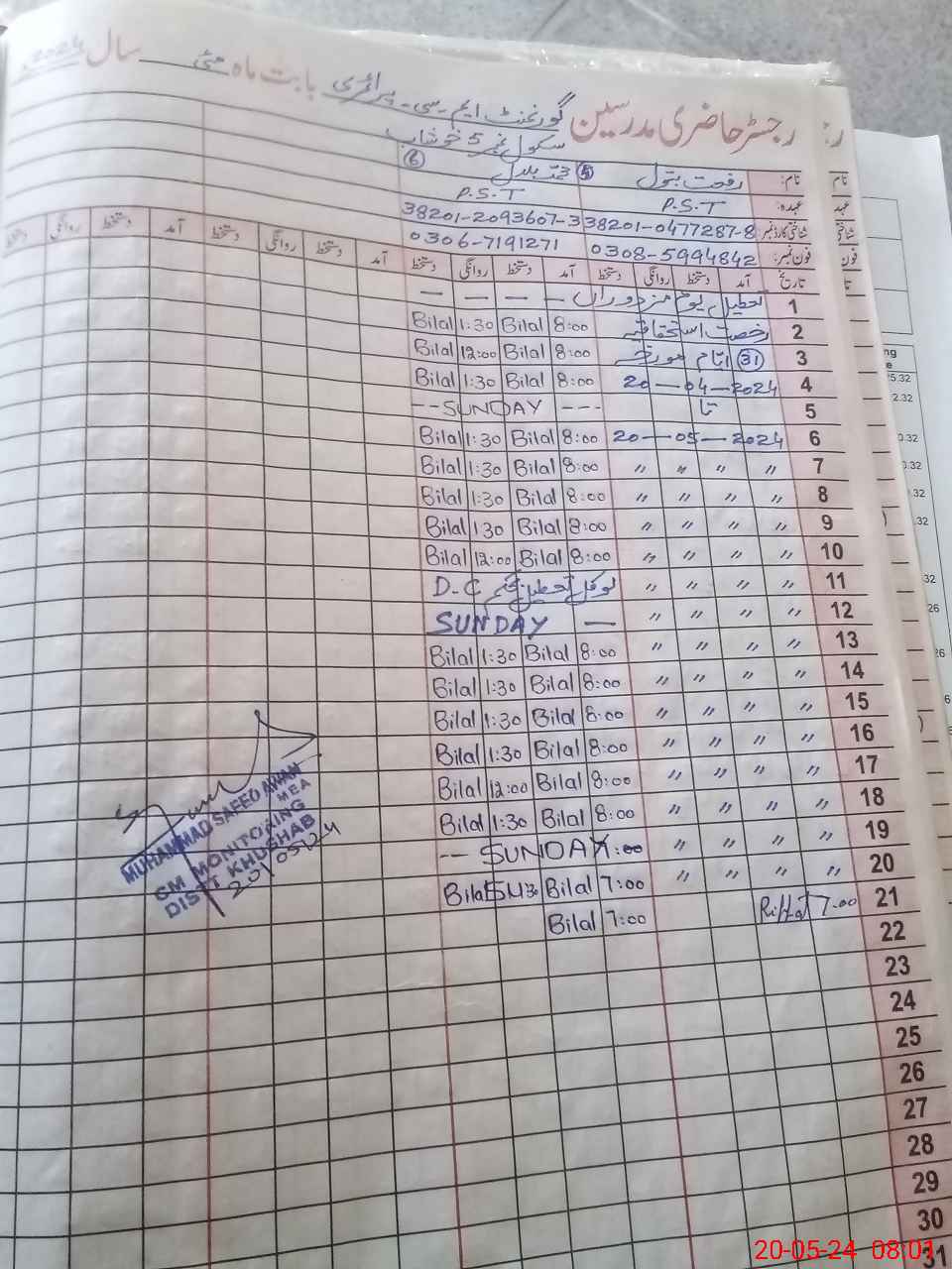| Name: Sa**** Kh**** Designation: (School Headmaster's/Headmistress's) PST Phone/Cell Number: 03**** |