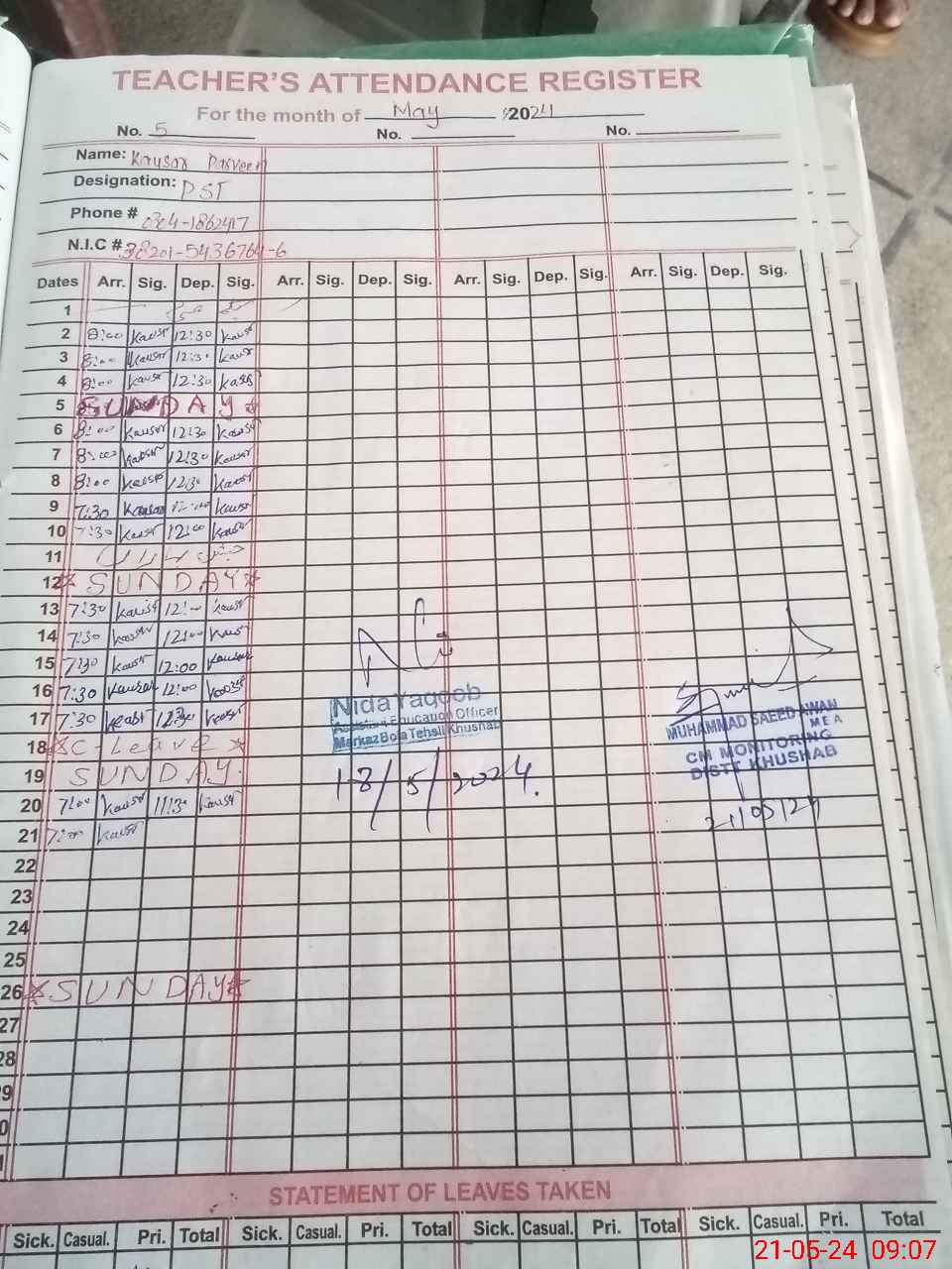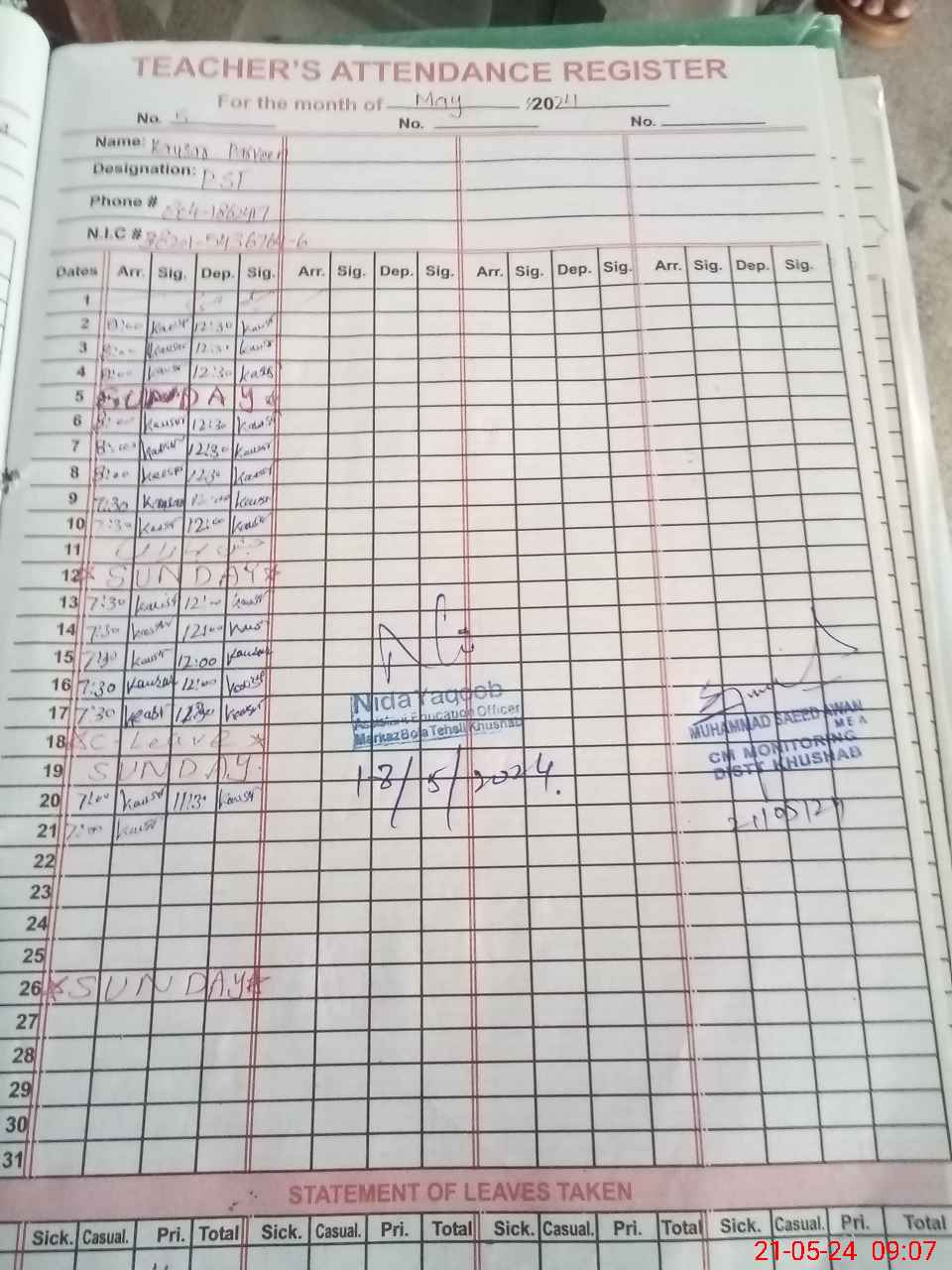 | CNIC | Full Name | Designation | R/C | Absence During Last Calender Month |