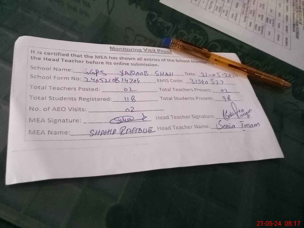 | Attendance Register | Head Teacher | MEA with School | Visit Proof |