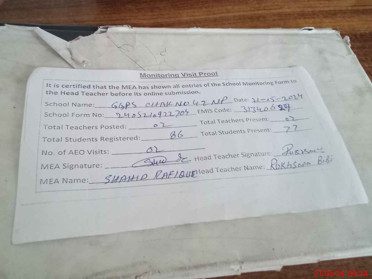 | Attendance Register | Head Teacher | MEA with School | Visit Proof |