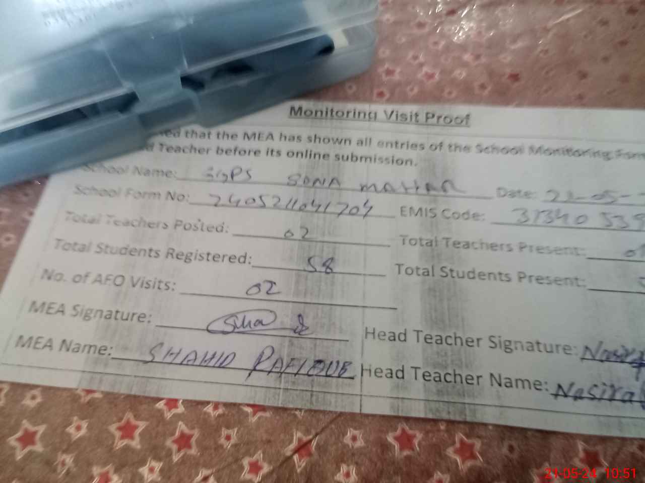 | Certified that this School was Inspected by the Undersigned MEA/DMO Today and the Information Stated Above is as Per Record. | |||||