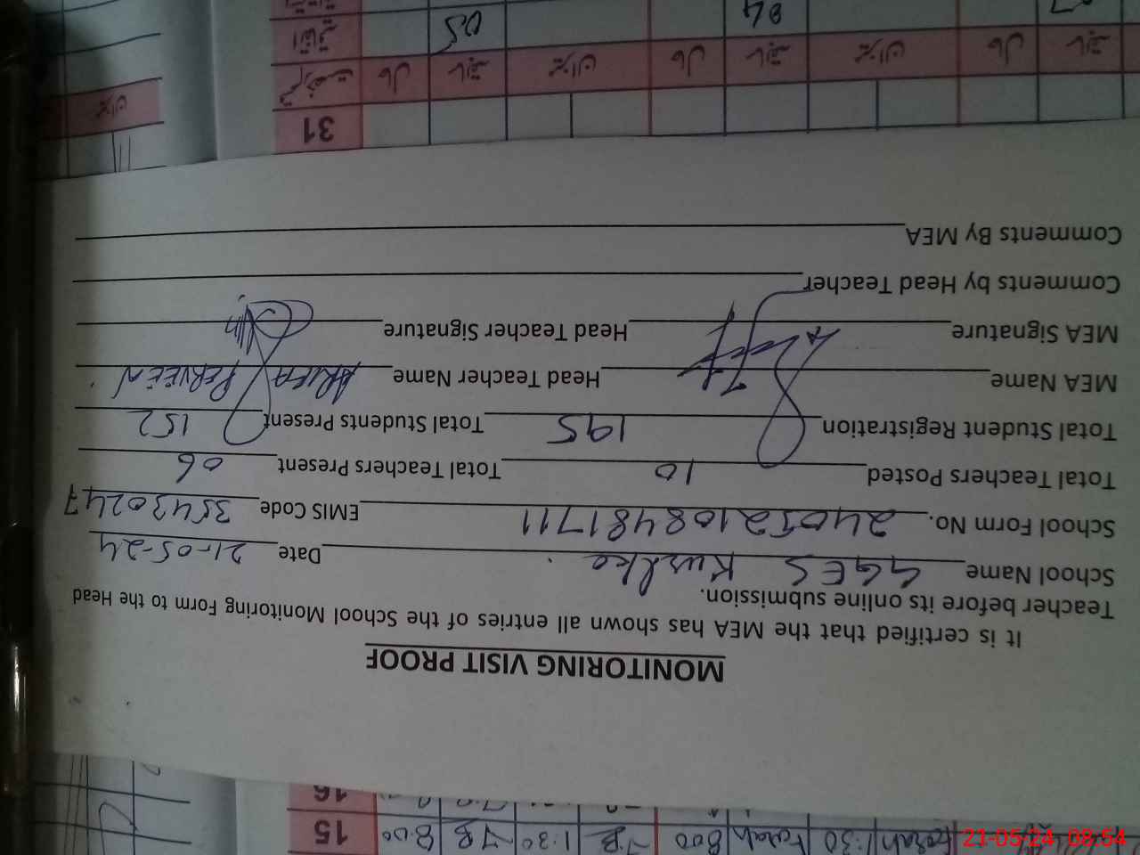 | Attendance Register | Head Teacher | MEA with School | Visit Proof |