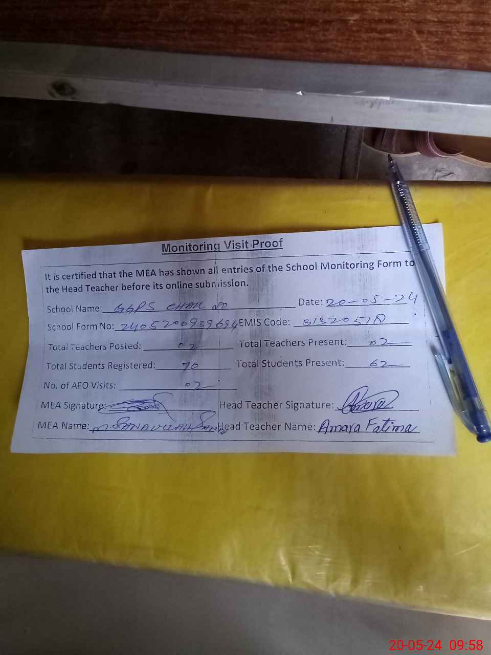 | Attendance Register | Head Teacher | MEA with School | Visit Proof |