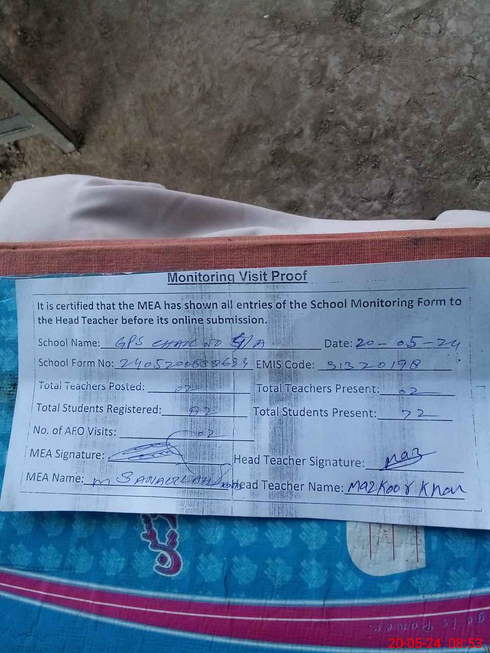 | Attendance Register | Head Teacher | MEA with School | Visit Proof |