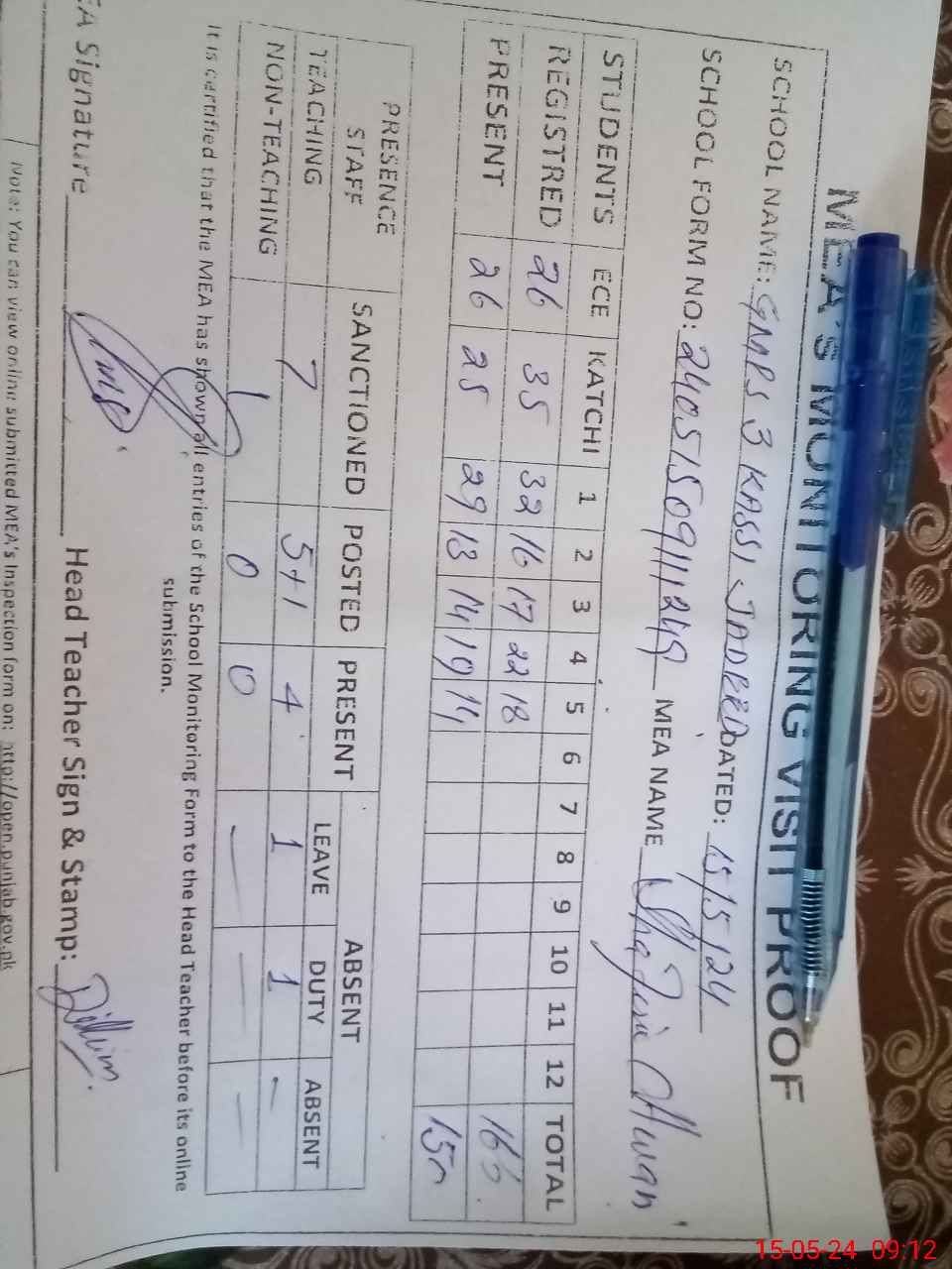 | Attendance Register | Head Teacher | MEA with School | Visit Proof |