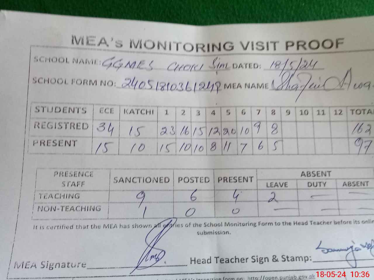| Attendance Register | Head Teacher | MEA with School | Visit Proof |