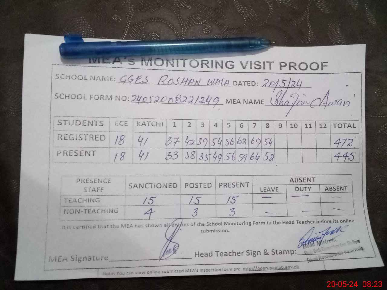 | Attendance Register | Head Teacher | MEA with School | Visit Proof |