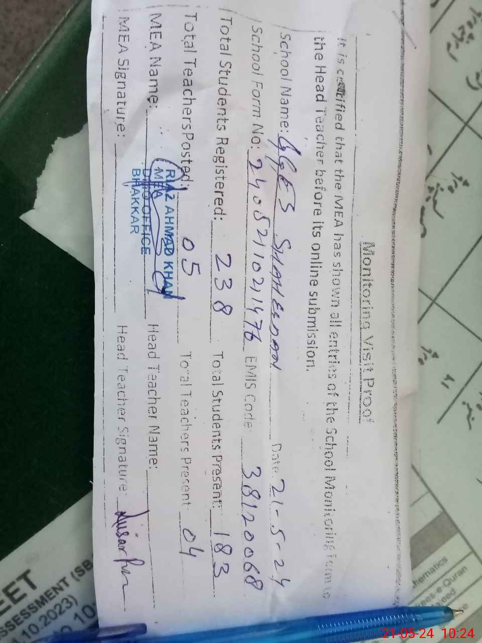 | Certified that this School was Inspected by the Undersigned MEA/DMO Today and the Information Stated Above is as Per Record. | |||||