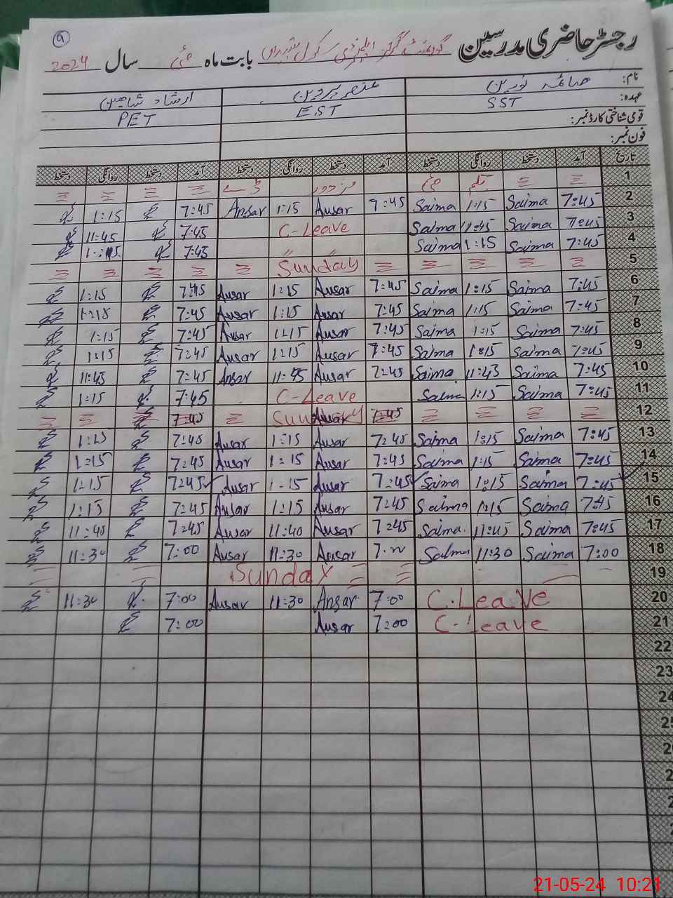 | CNIC | Full Name | Designation | R/C | Absence During Last Calender Month |