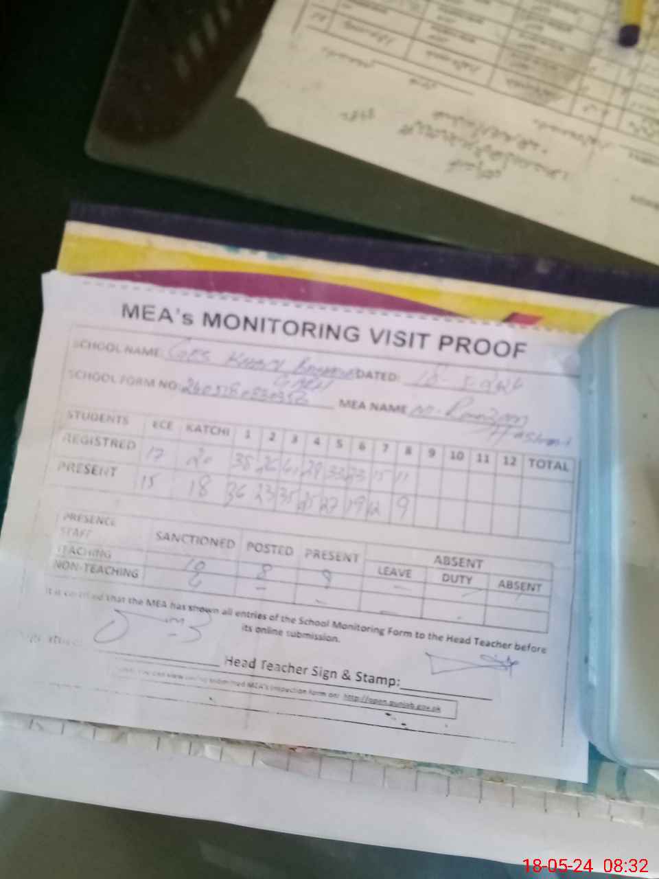 | Attendance Register | Head Teacher | MEA with School | Visit Proof |