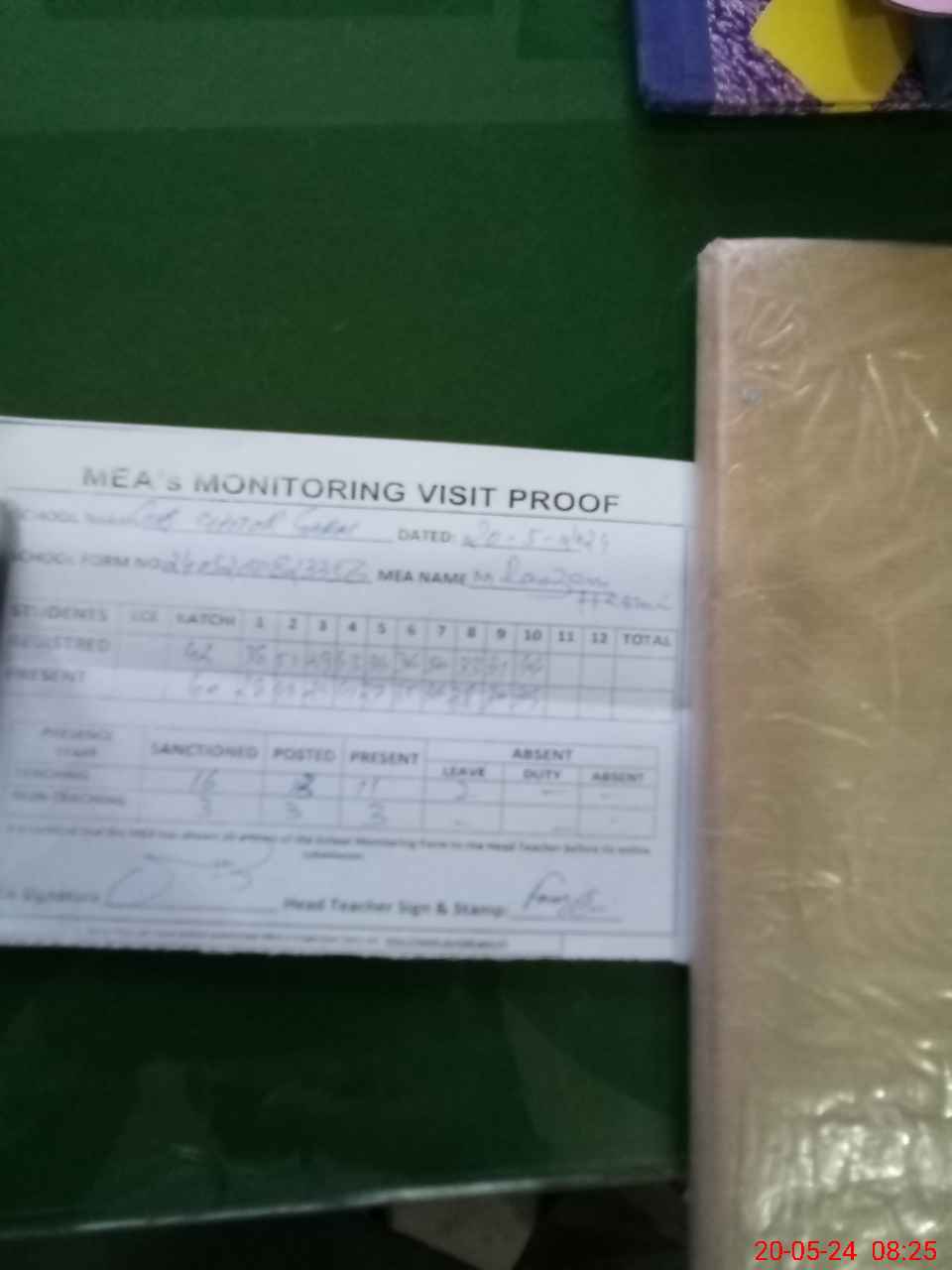 | Attendance Register | Head Teacher | MEA with School | Visit Proof |