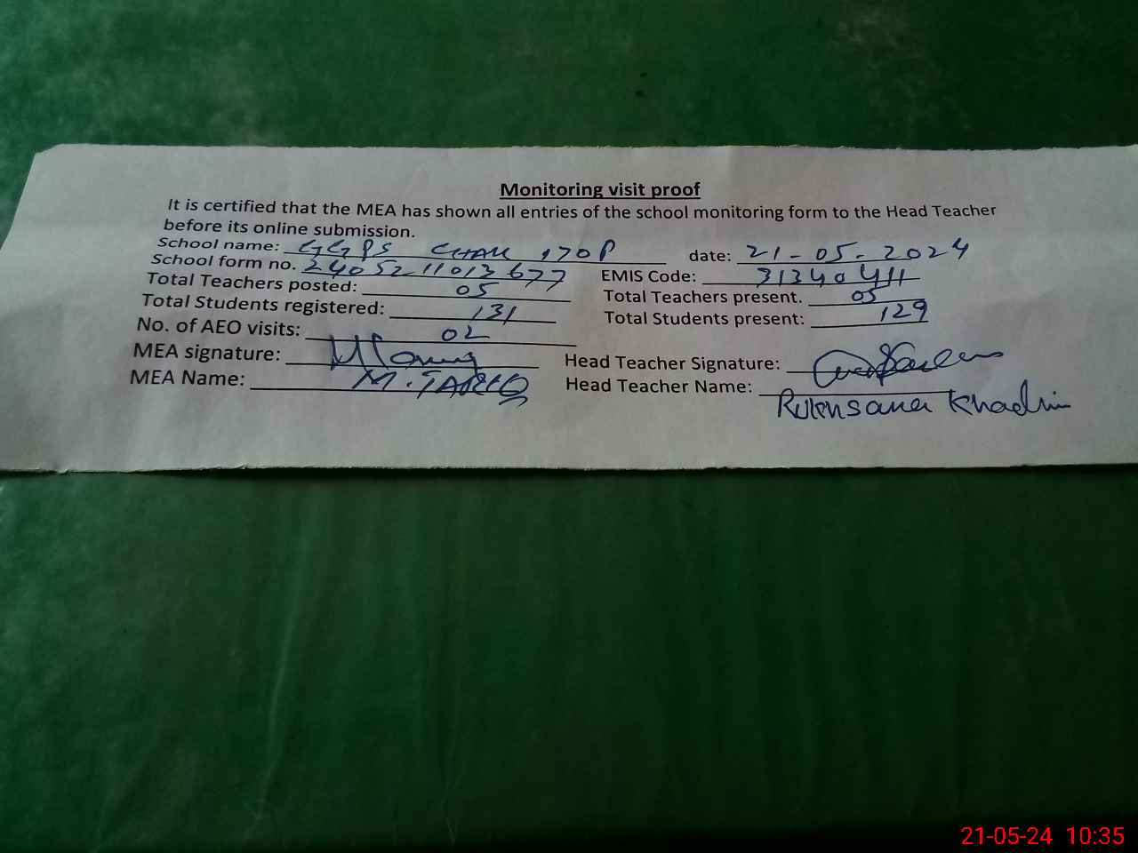 | Attendance Register | Head Teacher | MEA with School | Visit Proof |