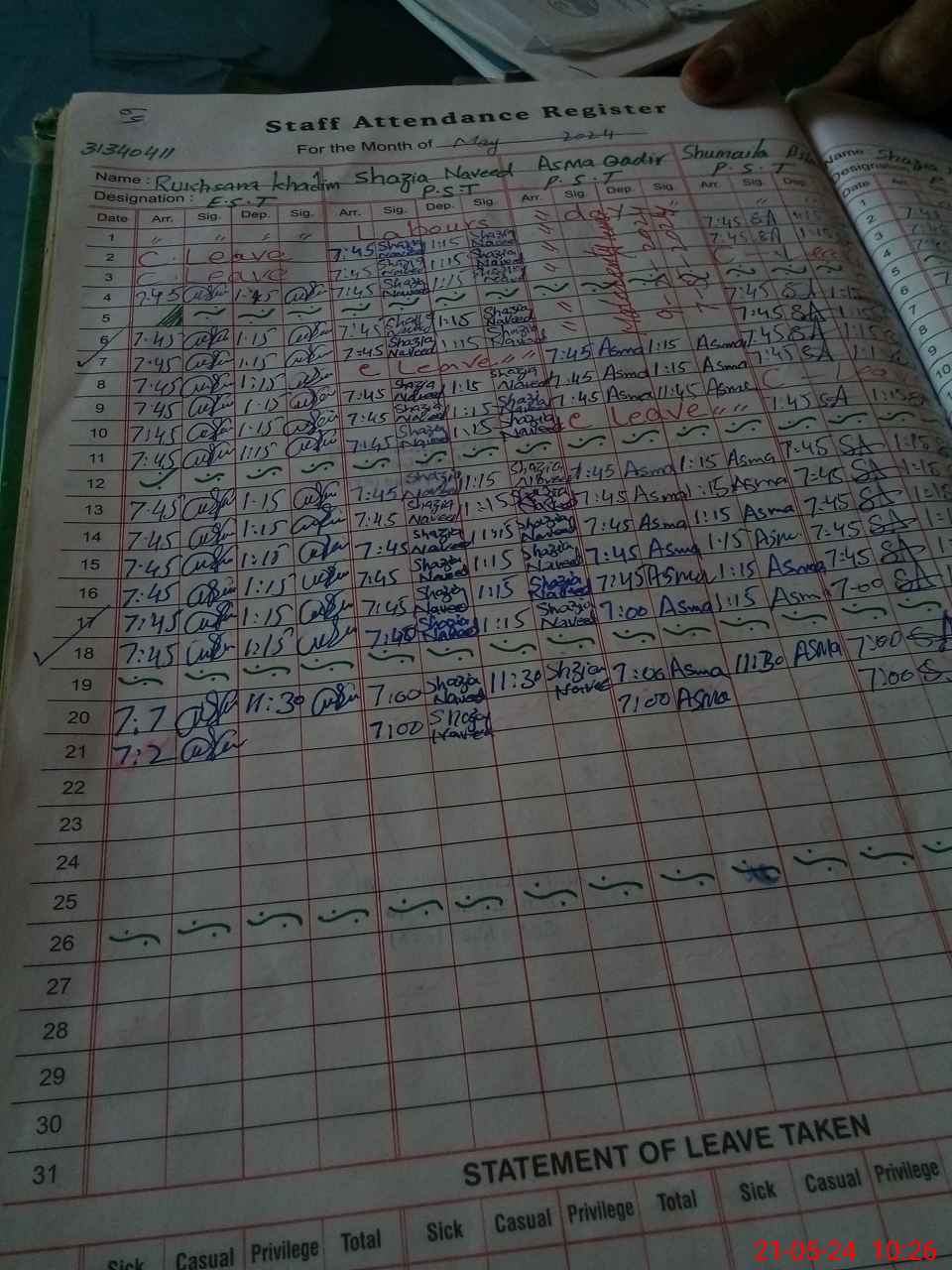 | Leave | Duty | Absent | Maternity | Medical | Ex- Pak |