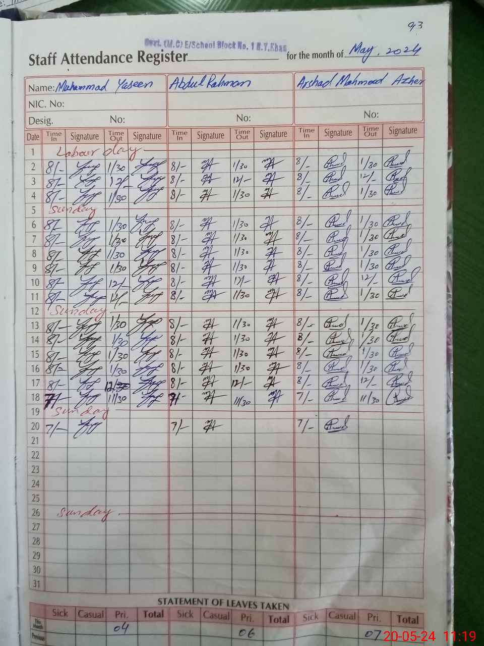 | CNIC | Full Name | Designation | R/C | Absence During Last Calender Month |
