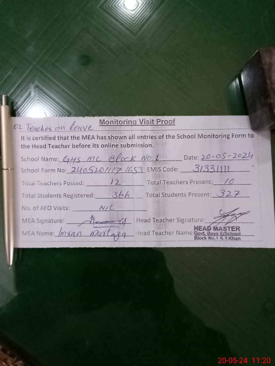 | Attendance Register | Head Teacher | MEA with School | Visit Proof |