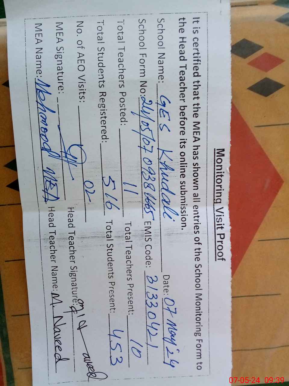 | Attendance Register | Head Teacher | MEA with School | Visit Proof |
