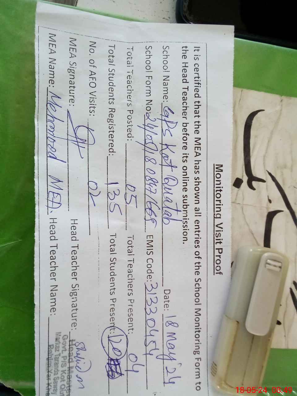 | EMIS Code: 31330454 | Name of School: GPS KOT QUATAB | |||