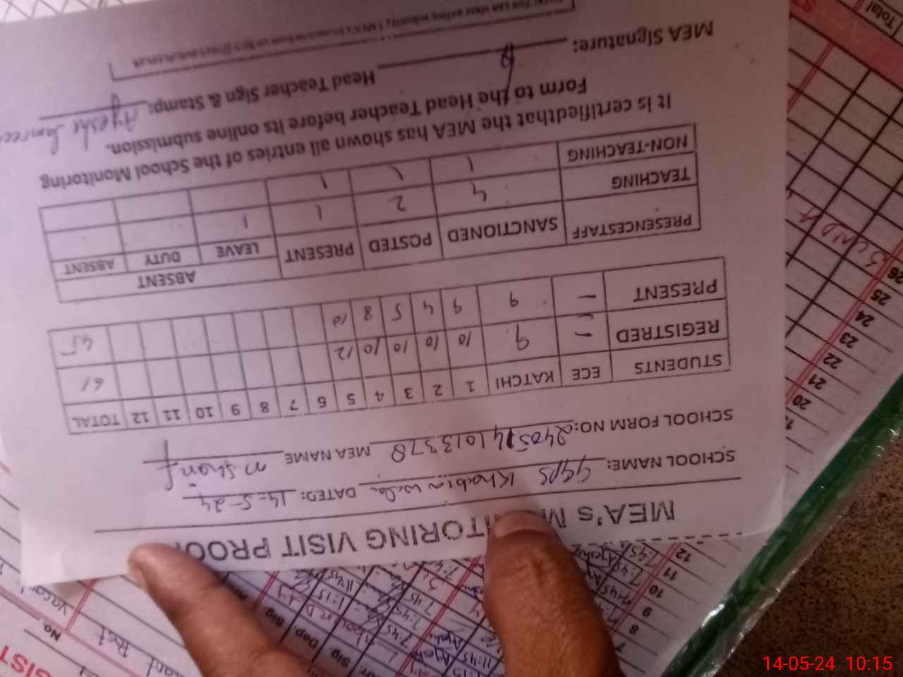 | Attendance Register | Head Teacher | MEA with School | Visit Proof |