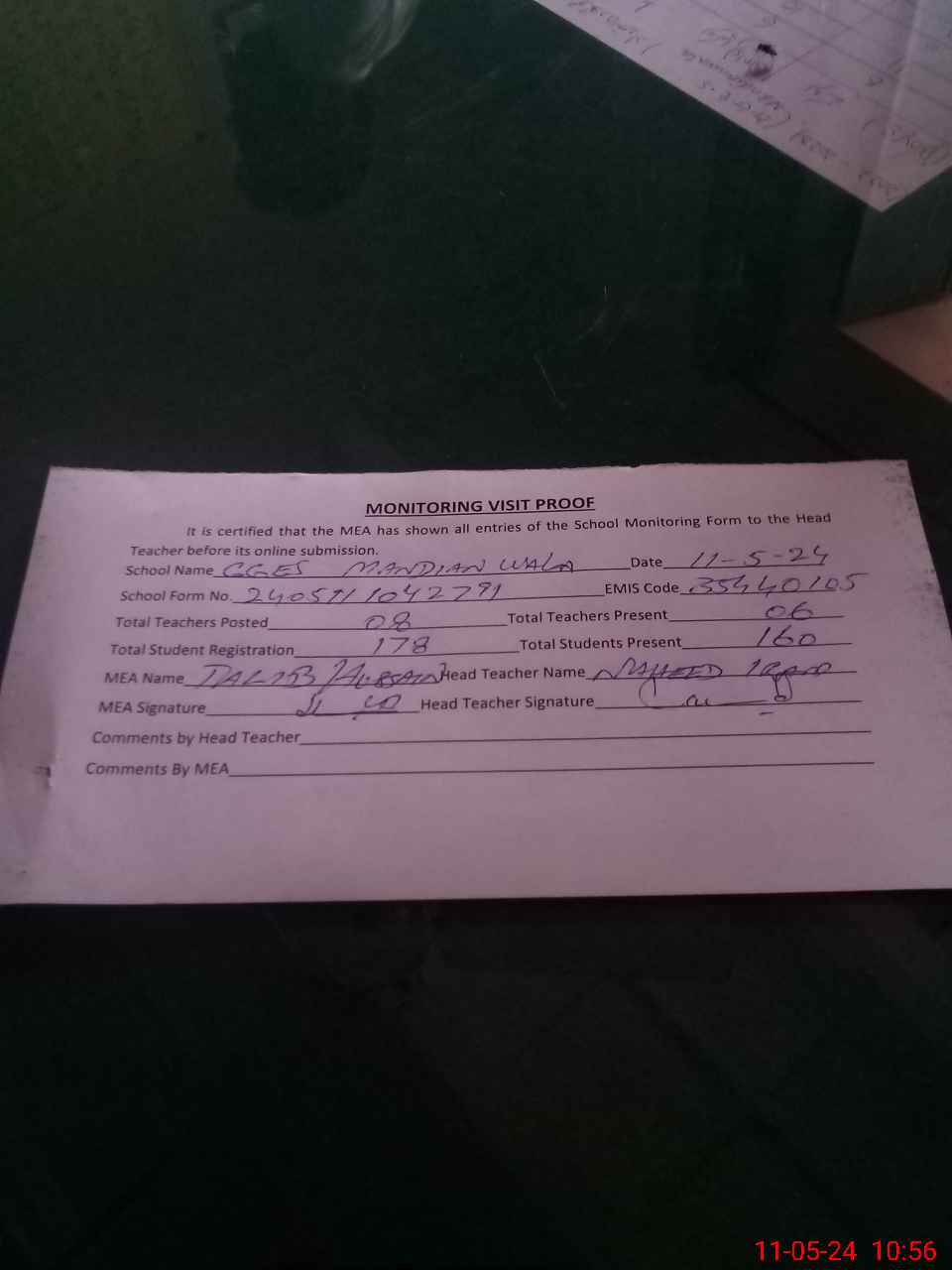 | Attendance Register | Head Teacher | MEA with School | Visit Proof |