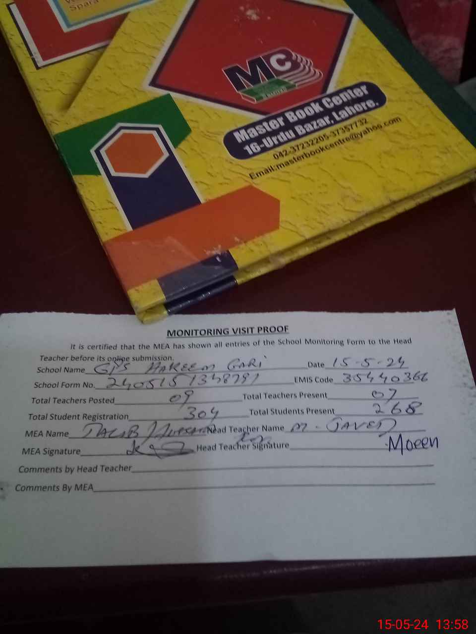 | Attendance Register | Head Teacher | MEA with School | Visit Proof |