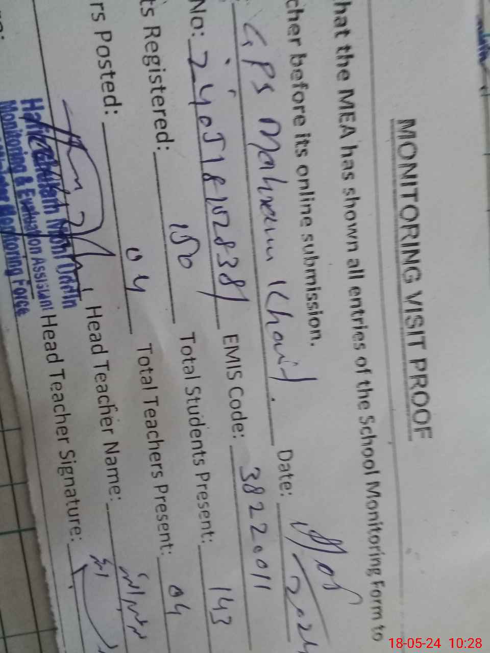 | Attendance Register | Head Teacher | MEA with School | Visit Proof |