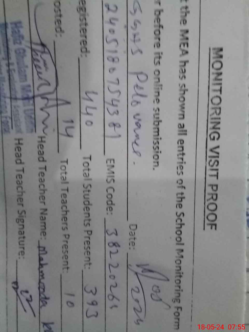 | Certified that this School was Inspected by the Undersigned MEA/DMO Today and the Information Stated Above is as Per Record. | |||||