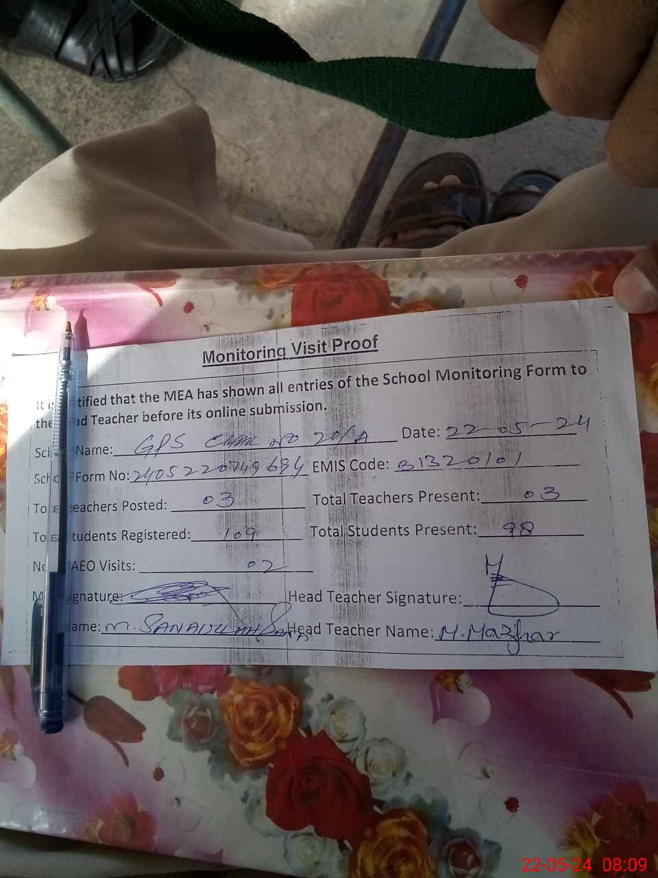| Monitoring Date: 22-05-2024 | Start Time: 22-05-2024 07:49 AM | End Time: 22-05-2024 08:09 AM | Name of MEA: Mu**** Sa**** Ul**** Sa**** | |