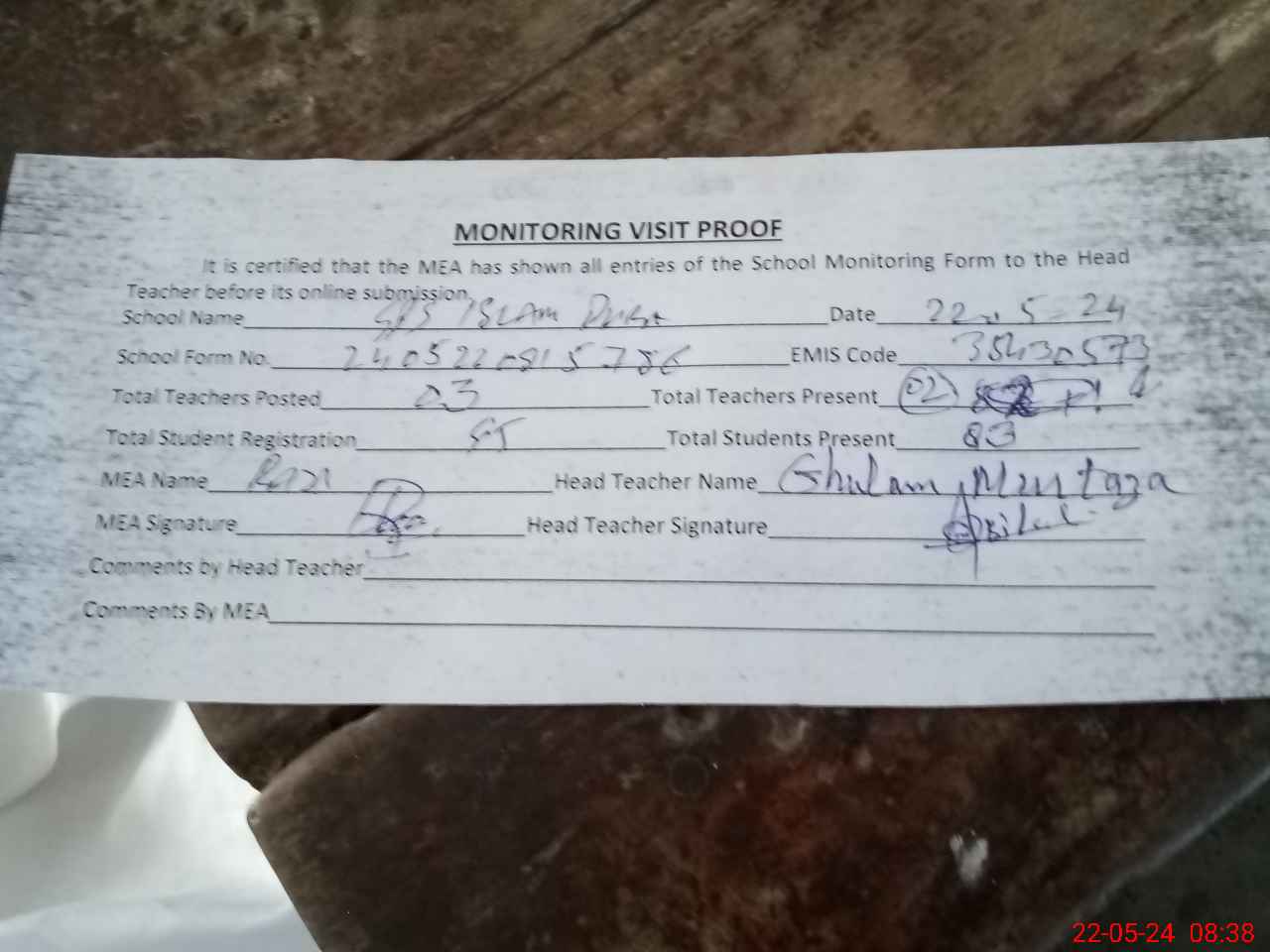 | Attendance Register | Head Teacher | MEA with School | Visit Proof |