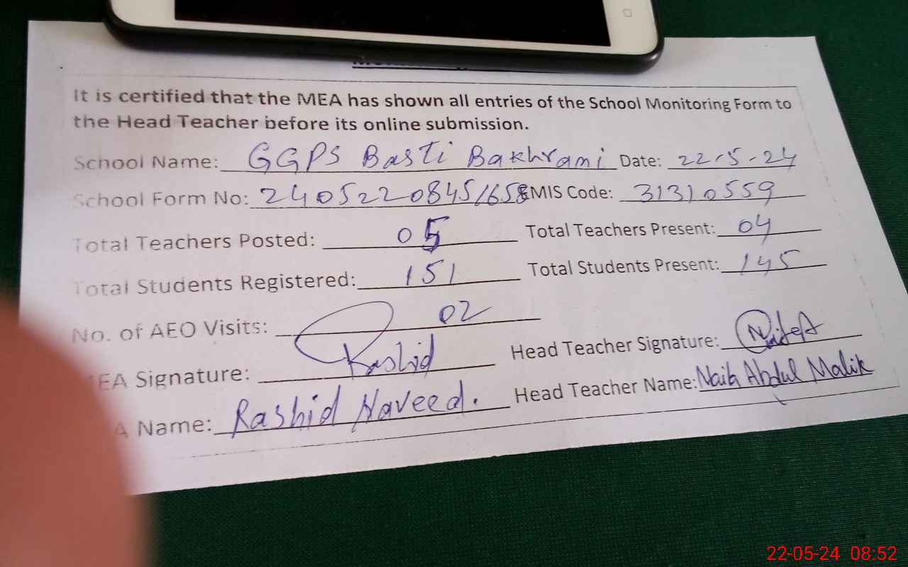 | Name: Na**** Ab**** Ma**** Designation: (School Headmaster's/Headmistress's) PST Phone/Cell Number: 03**** |