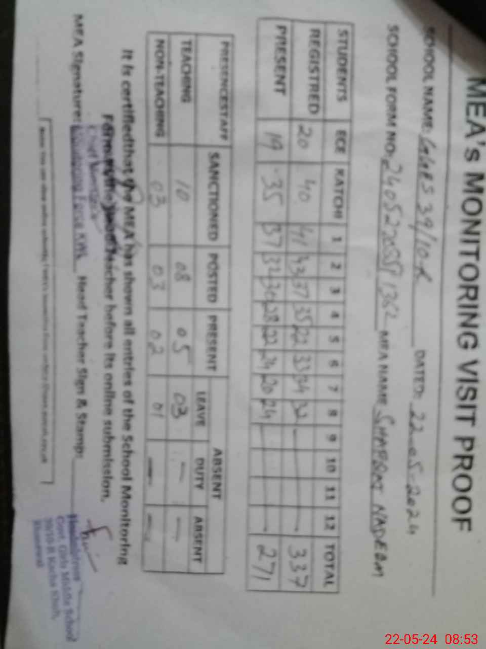 | Attendance Register | Head Teacher | MEA with School | Visit Proof |
