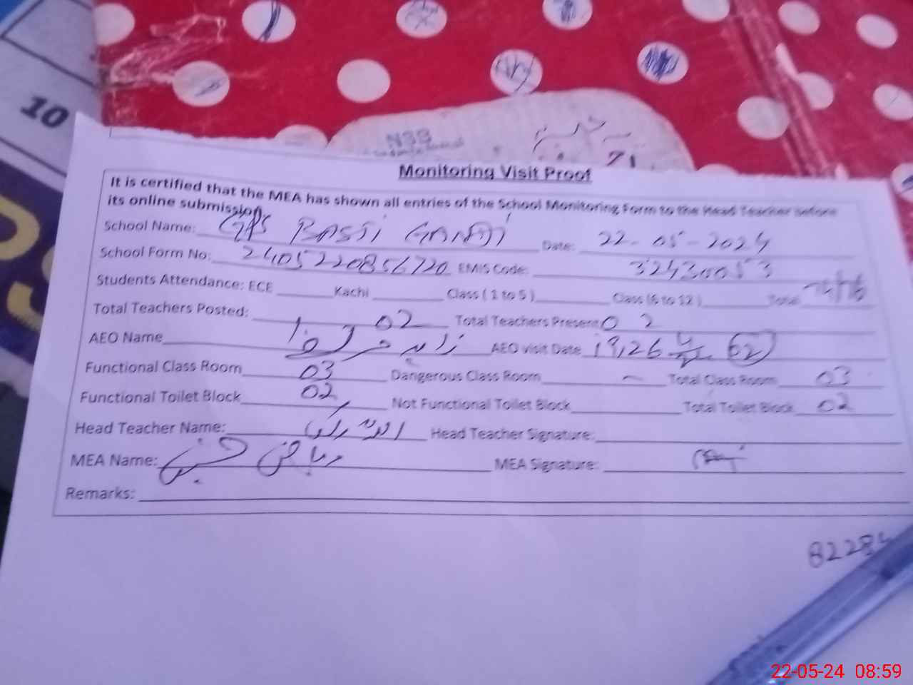 | Certified that this School was Inspected by the Undersigned MEA/DMO Today and the Information Stated Above is as Per Record. | |||||