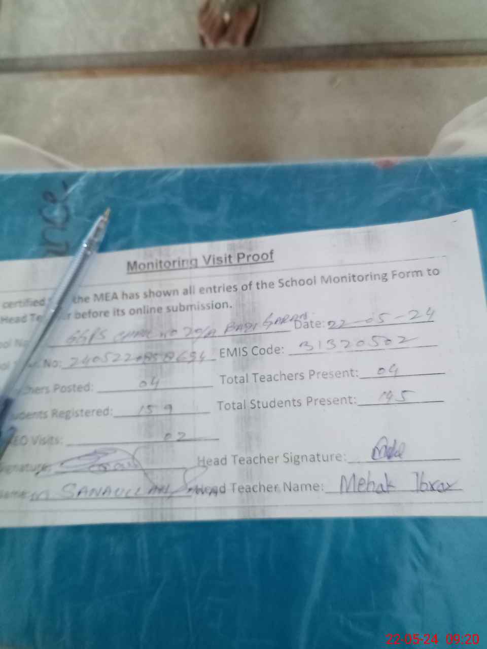 | Attendance Register | Head Teacher | MEA with School | Visit Proof |