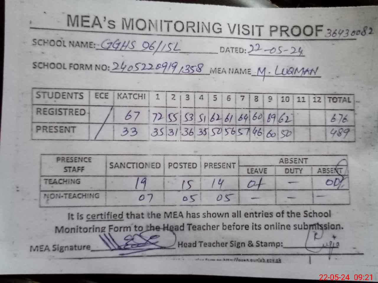 | Attendance Register | Head Teacher | MEA with School | Visit Proof |