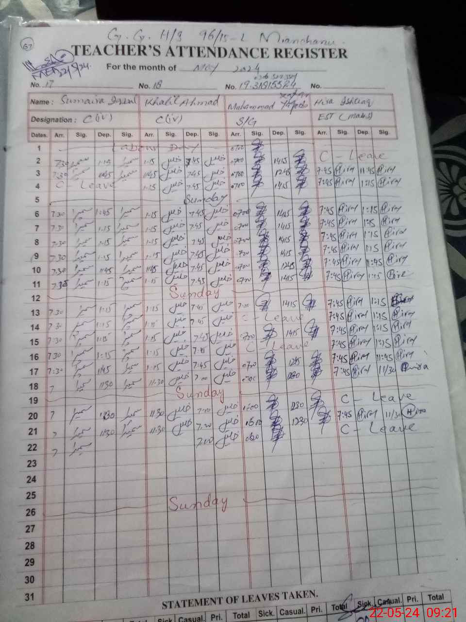| CNIC | Full Name | Designation | R/C | Absence During Last Calender Month |