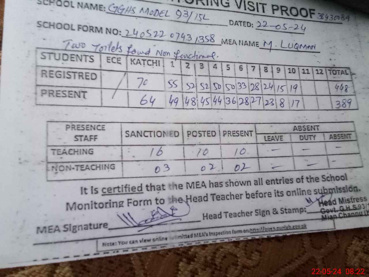 | Attendance Register | Head Teacher | MEA with School | Visit Proof |
